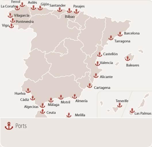 O quinto porto mais movimentado de toda a Europa é também o segundo maior da Espanha: o porto de Valência. Este porto é impressionante em tamanho, com um tráfego anual de 57 milhões de toneladas em capacidade de carga. O volume anual de contentores foi de 4,2 milhões de TEU em 2010 e este número tem crescido na última década. Barcelona está situada na costa nordeste de Espanha e está localizada na província catalã do país, tal como é mencionado no mapa dos portos espanhóis. Este porto existe há mais de 2000 anos e continua forte em termos de comércio e serviços portuários. Porto bilbao, localizado na Baía de Bilbao Abra, no País Basco, este porto também é chamado de porto exterior. Este porto tem sido popular desde os tempos medievais e está associado ao comércio do aço e do ferro da época.